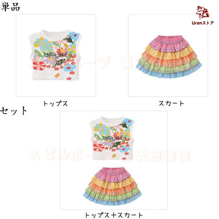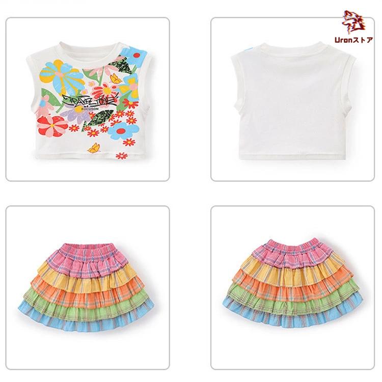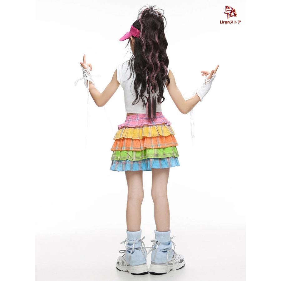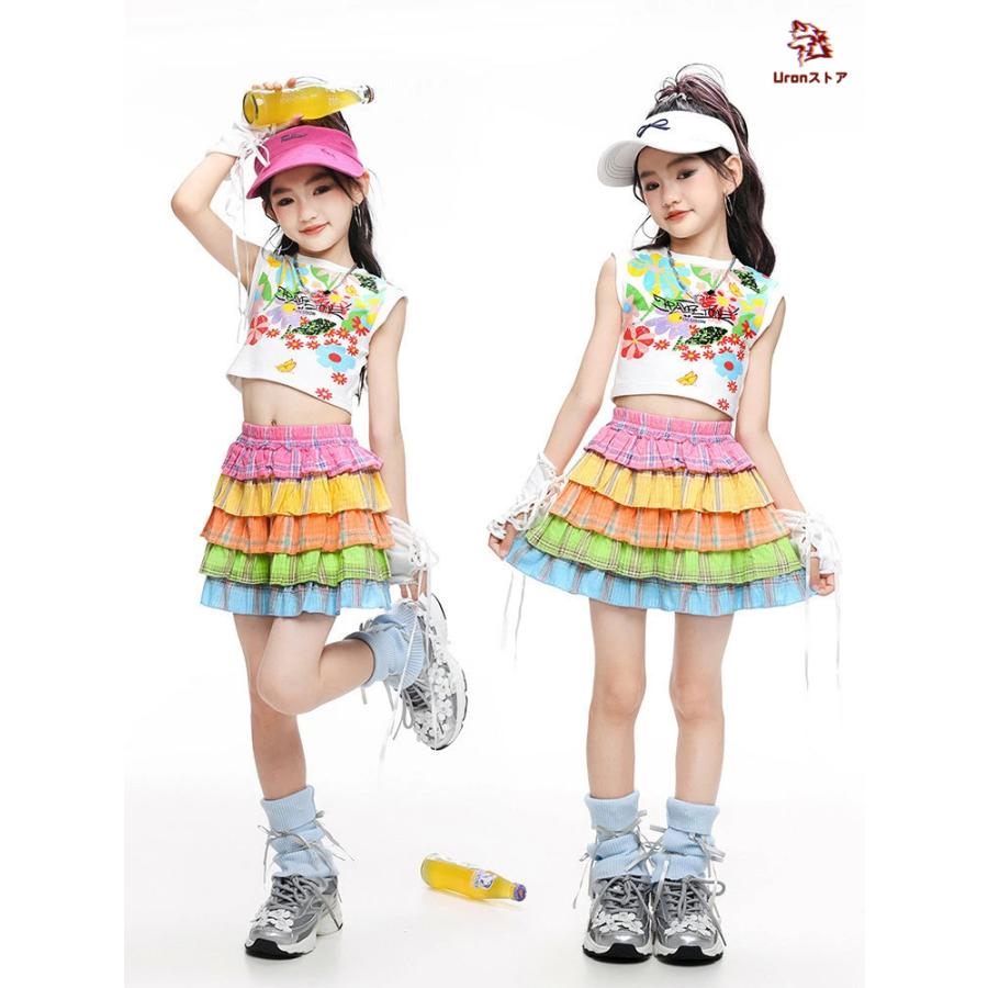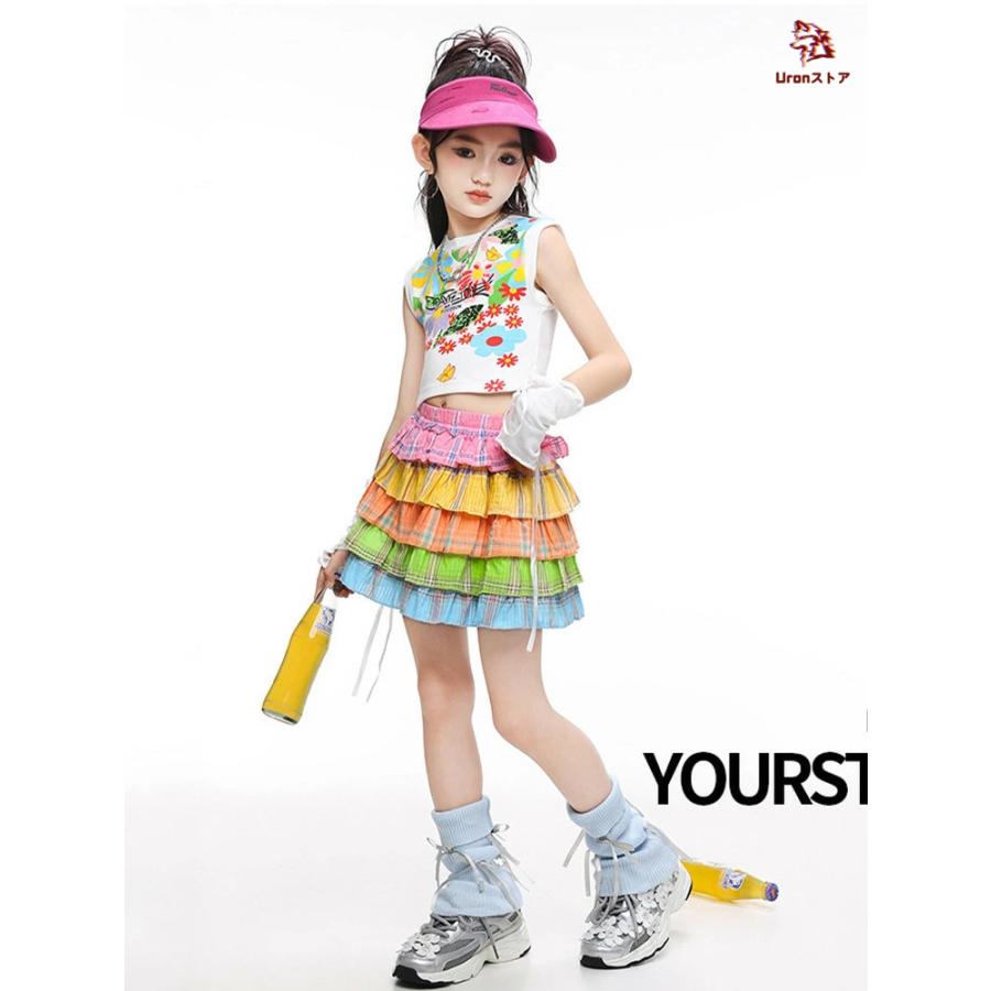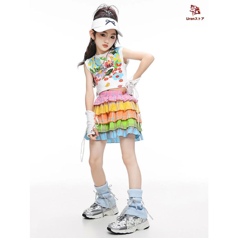 キッズ ダンス衣装 セットアップ 白 花柄 虹色 縞柄 タンクトップ スカート 女の子 jazz 韓国k-pop プリーツスカート プリンセスふわふわサリー へそ出し ショー