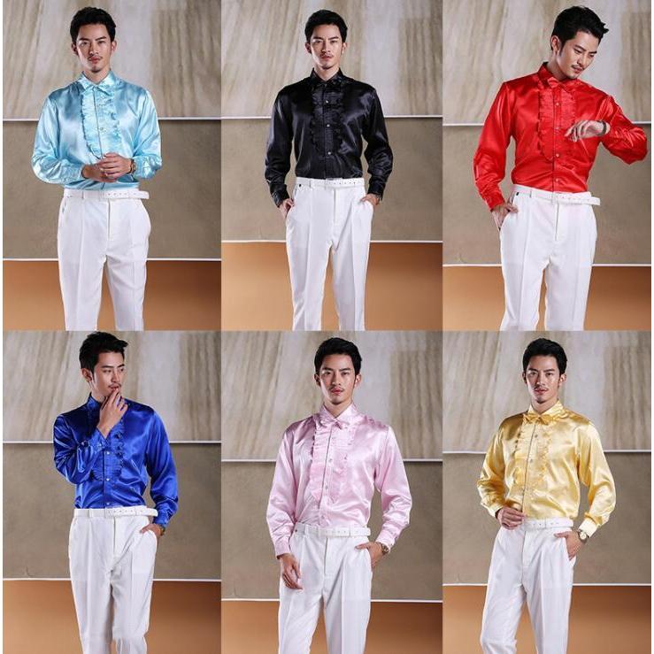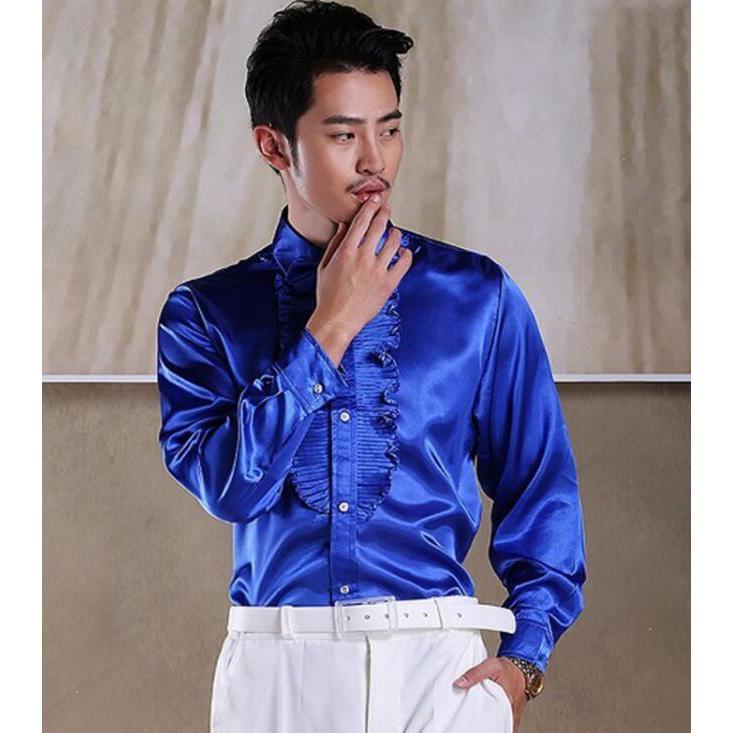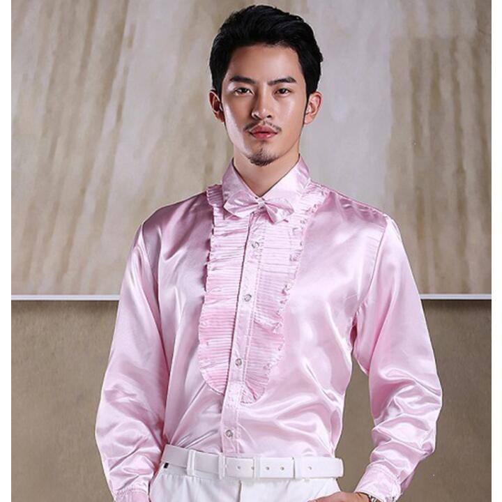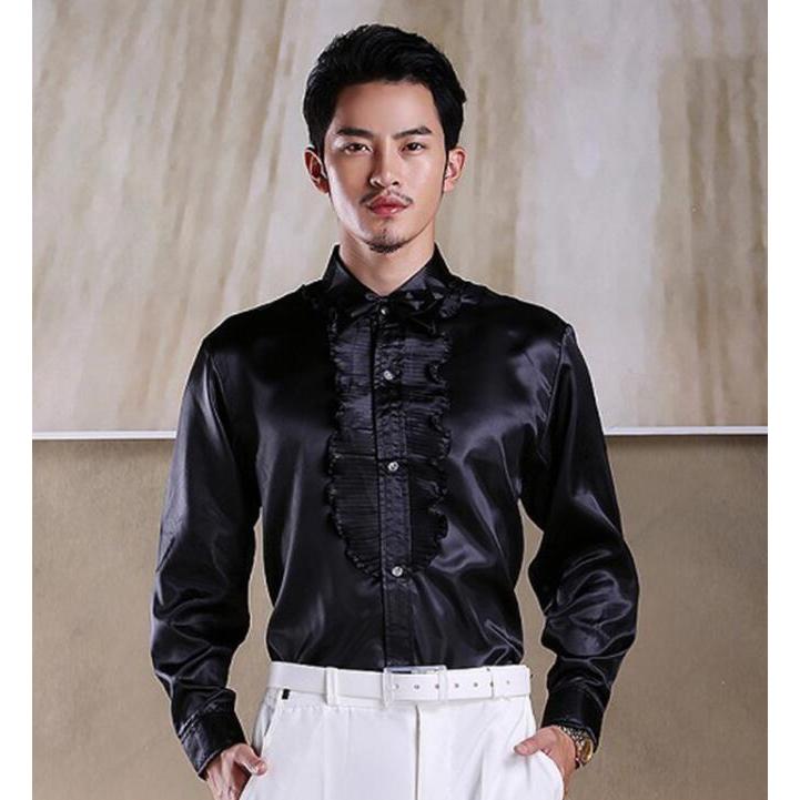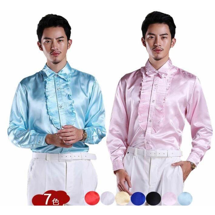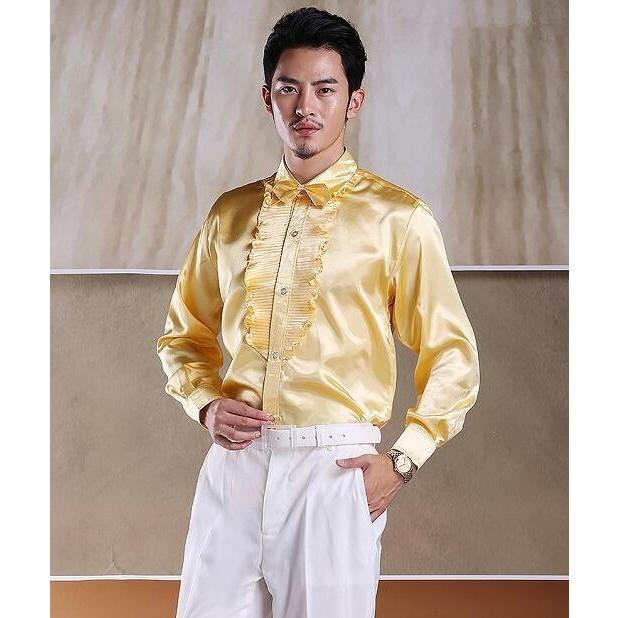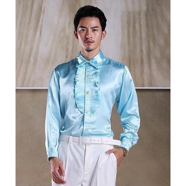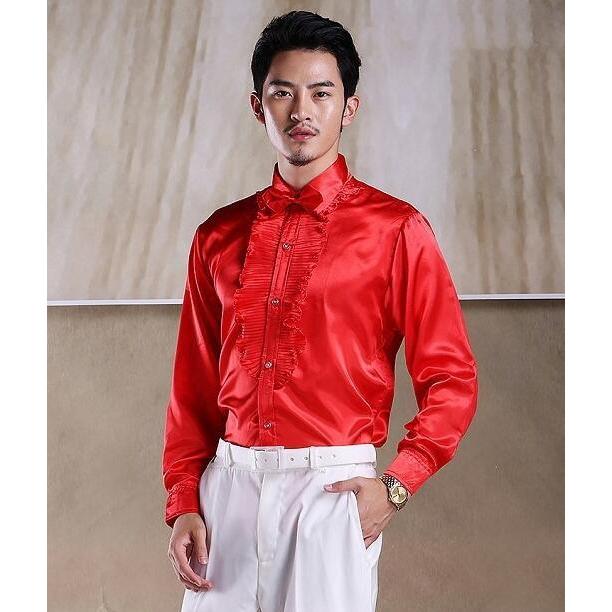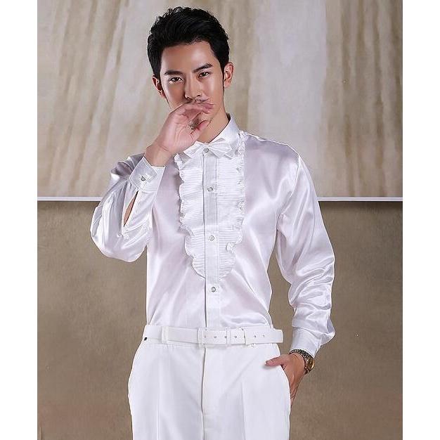 ステージ衣装 メンズ 社交ダンス衣装 ドレスシャツ タキシードシャツ サテン 光沢感あり フリル 長袖ワイシャツ 男性 大人 合唱服 カラオケ衣装 舞台衣装 舞台