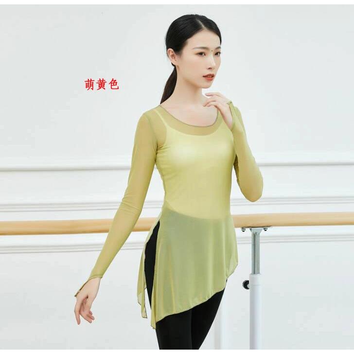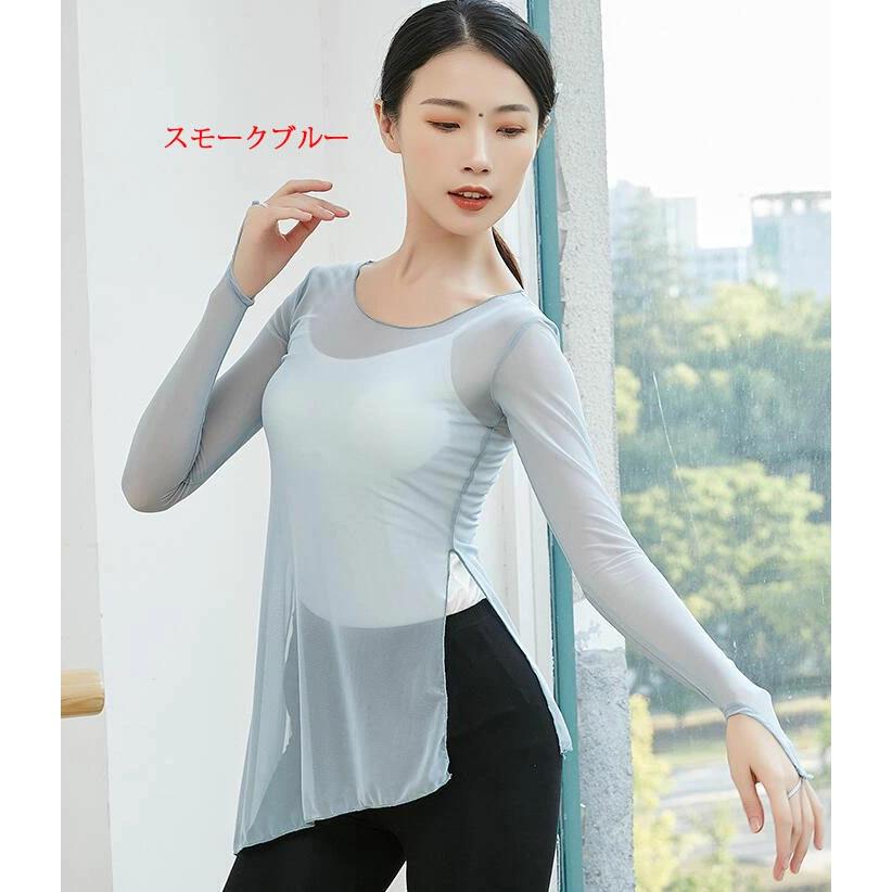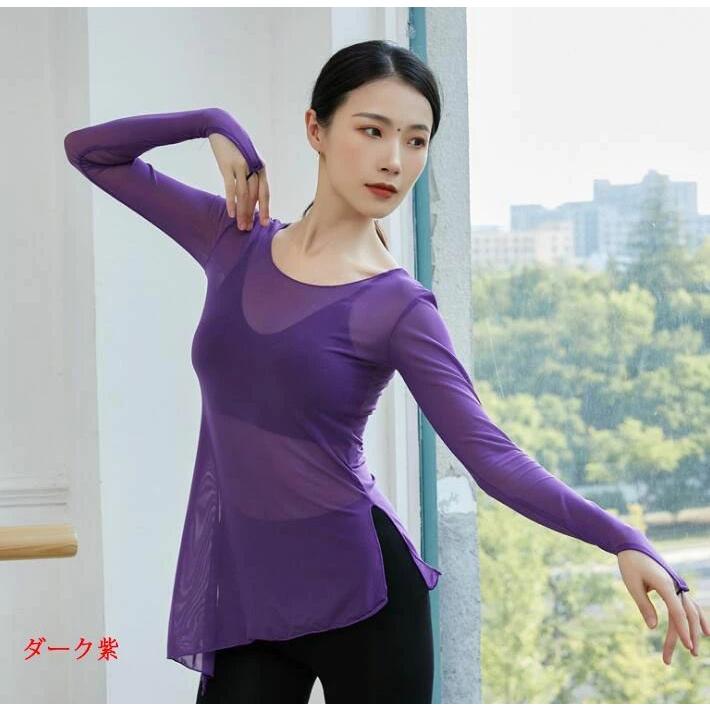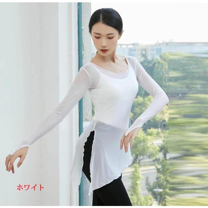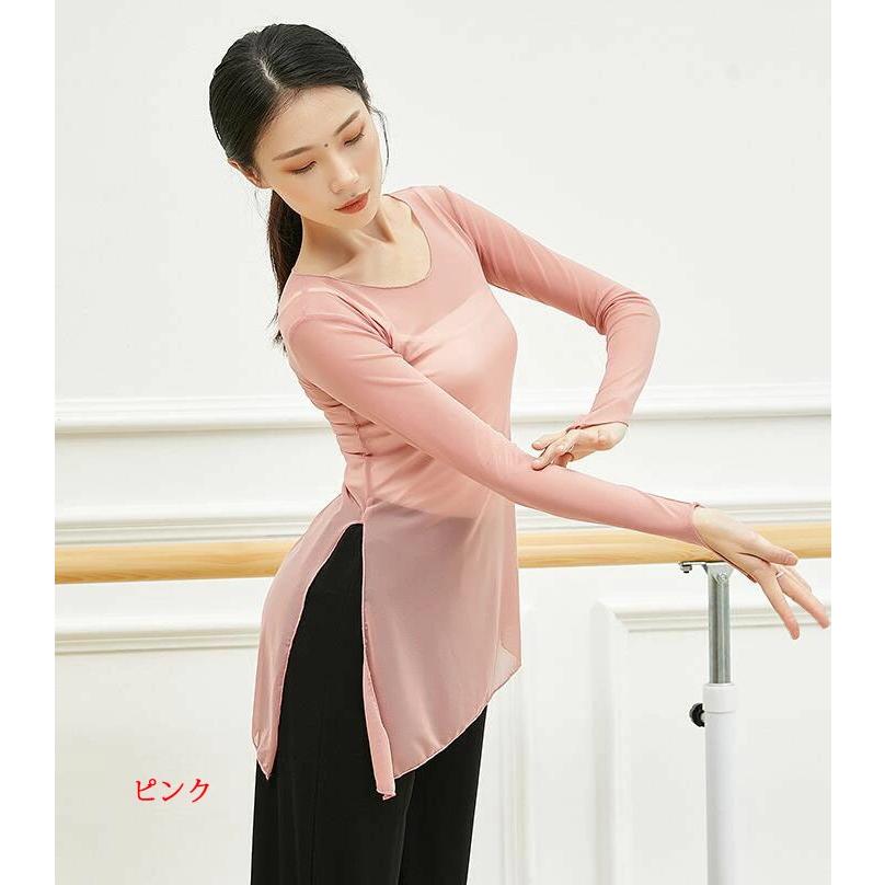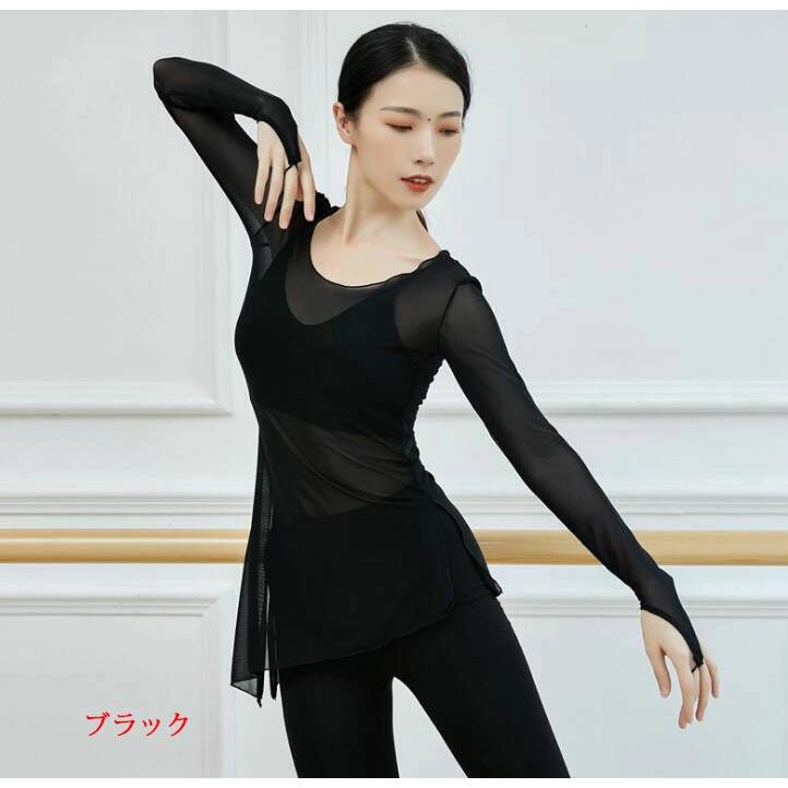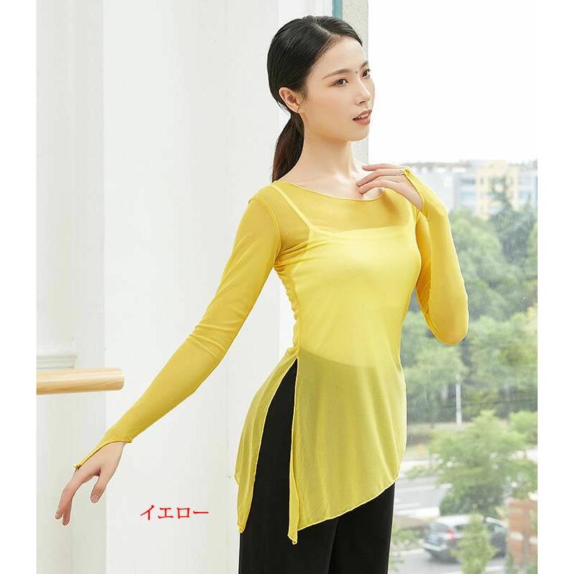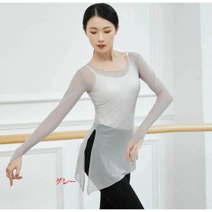 バレエ トップス レディースシースルーダンス衣装 古典ダンス衣装 ヨガ モダン 社交ダンス練習着 レッスンウェア 長袖ブラウス 透け感 サイドスリット 不