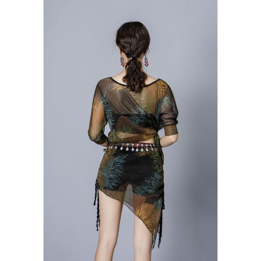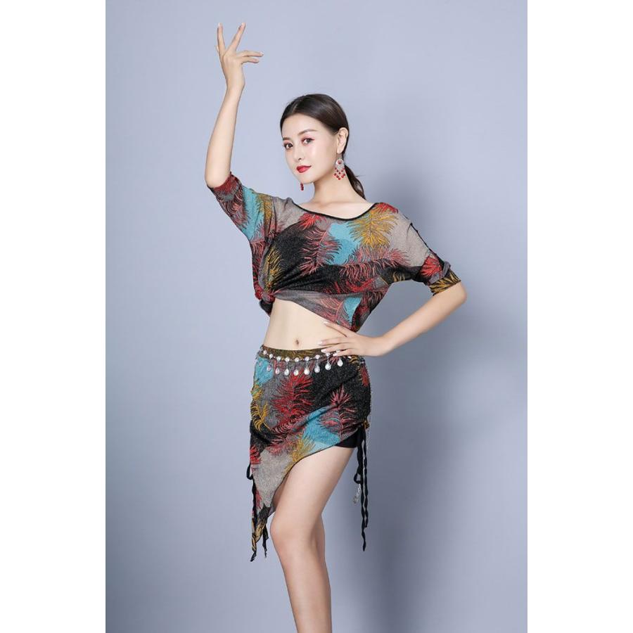 ベリーダンス 衣装 セット レッスン着 セットアップ ラメ入りメッシュ おしゃれ ベリーダンス衣装 ストレッチ生地 半袖 トップス ドルマンスリーブ ショート丈