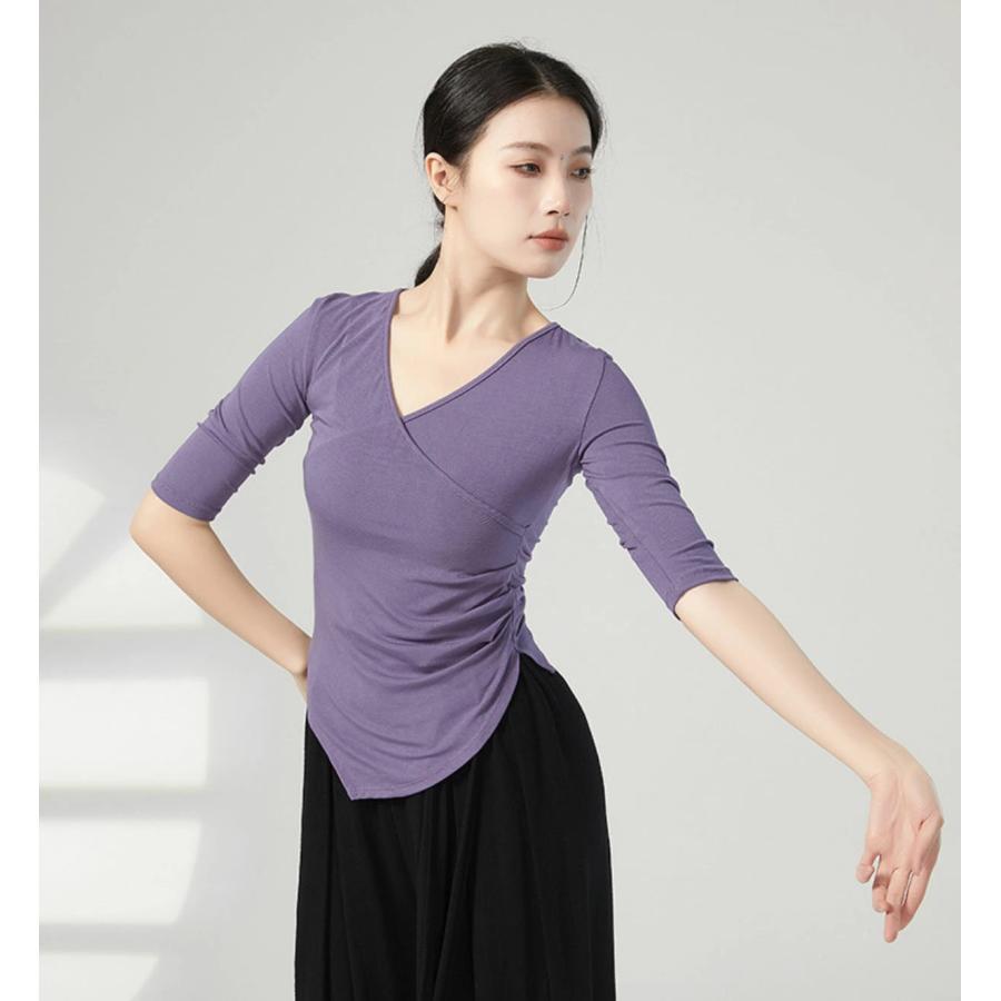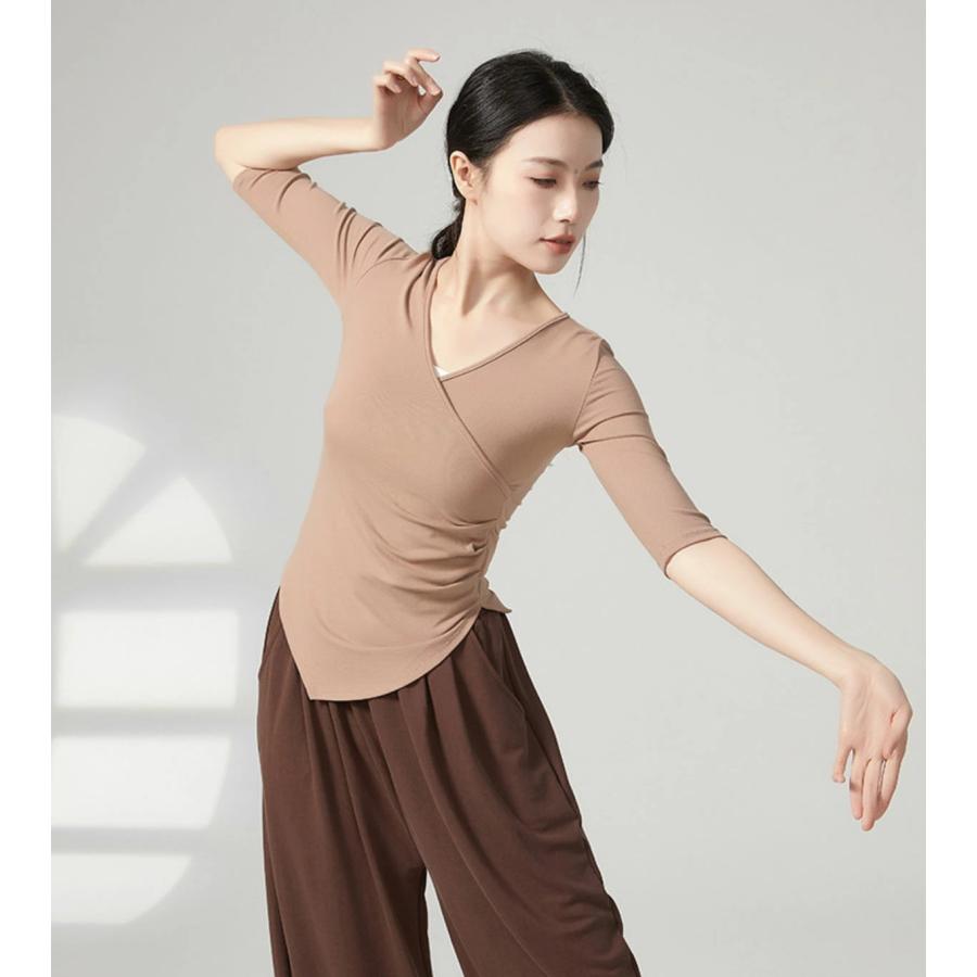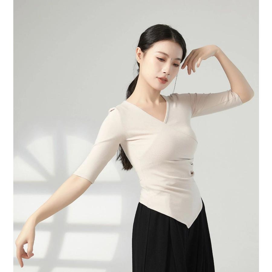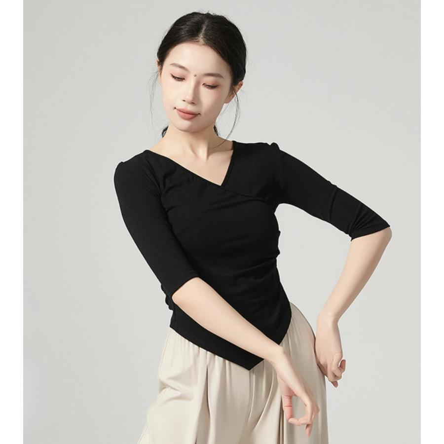 レディース ダンス 練習着 レッスンウエア 五分袖 tシャツ カットソー トップス Vネック 三角形裾 ストレッチ 動きやすい 無地 バレエ ヨガウエア 社交