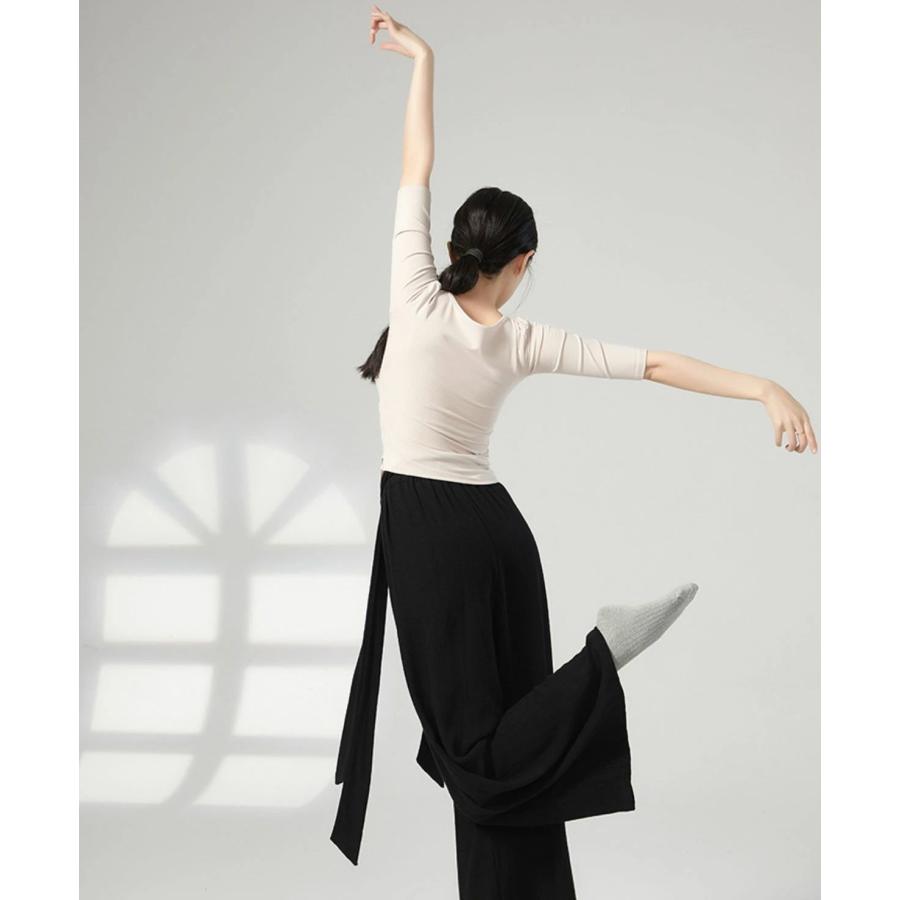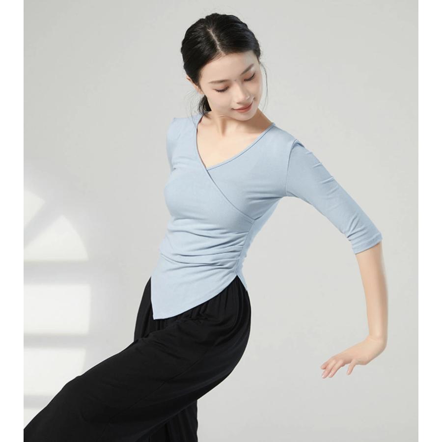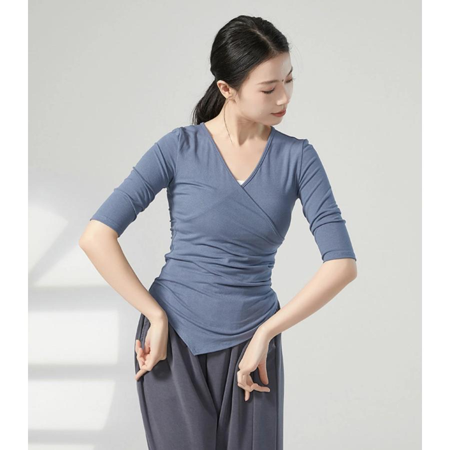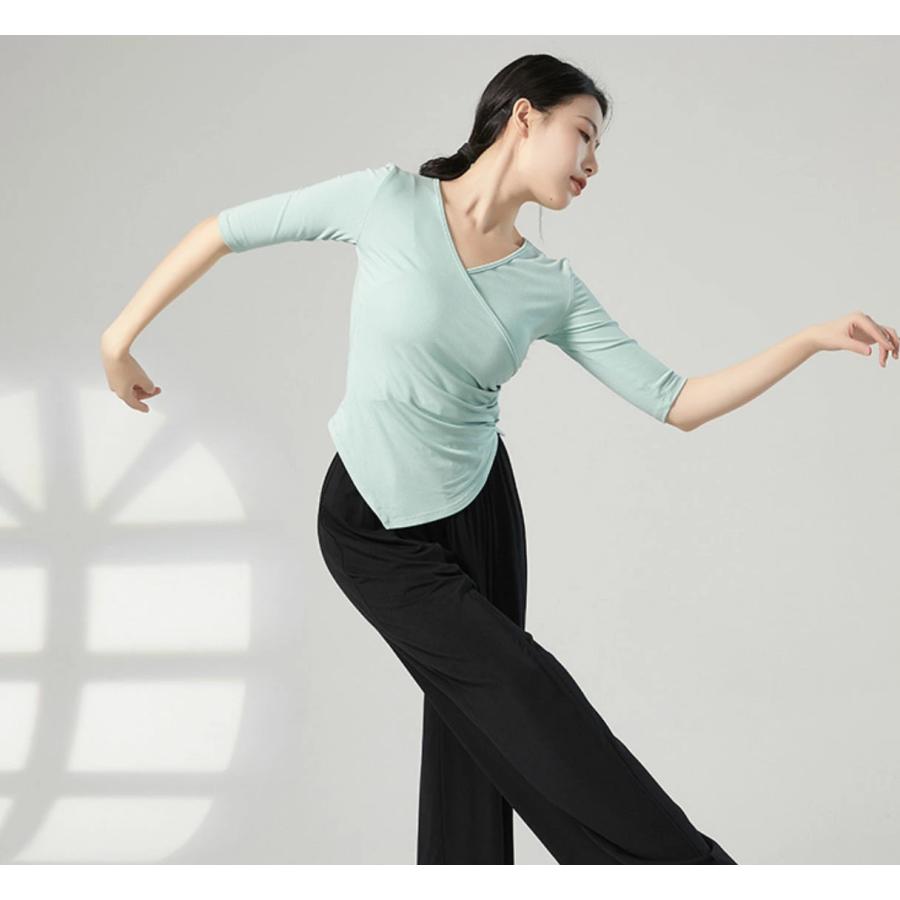レディース ダンス 練習着 レッスンウエア 五分袖 tシャツ カットソー トップス Vネック 三角形裾 ストレッチ 動きやすい 無地 バレエ ヨガウエア 社交