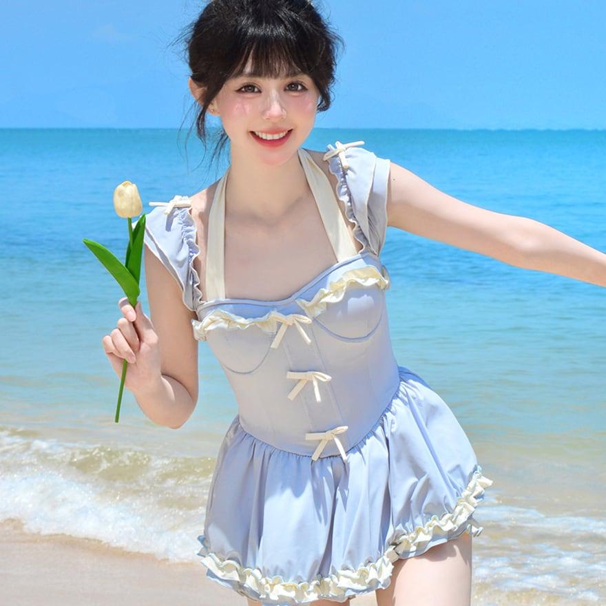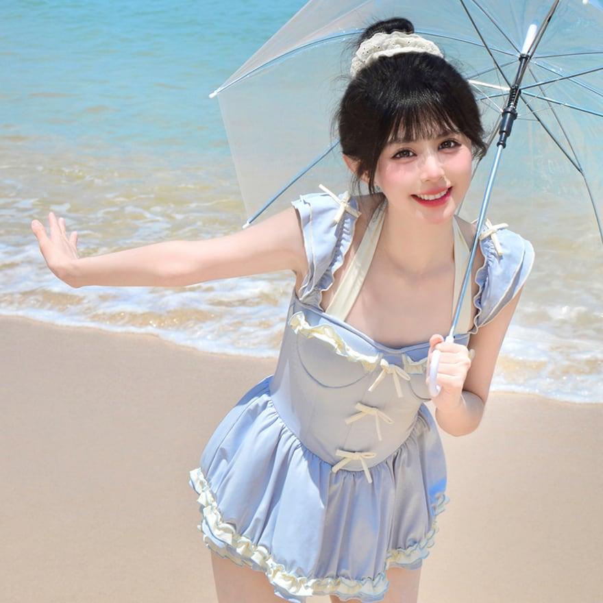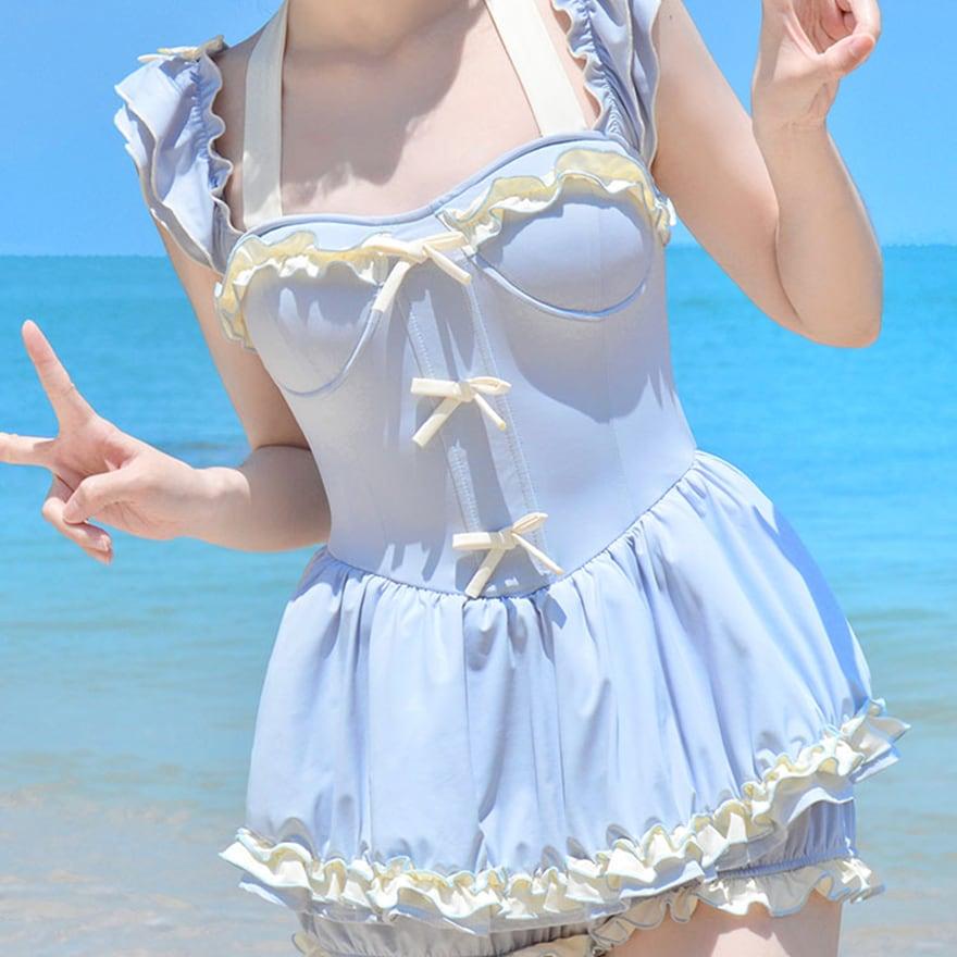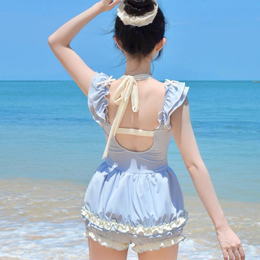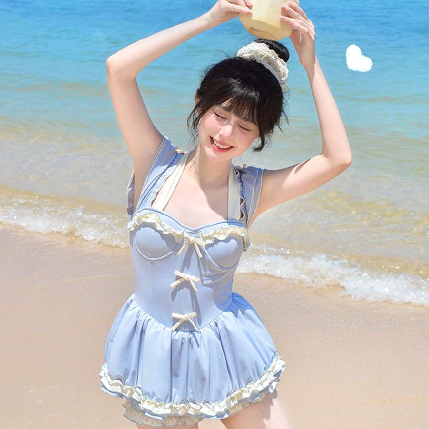 水着 かわいい ワンピースタイプ アクア ブルー レースアップ